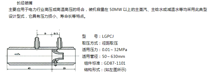 LGP型喷嘴流量计又叫标准喷嘴流量计、标准喷嘴、ISA1932喷嘴,与标准孔板、文丘里管流量计、文丘里喷嘴一样属于国家标准规定的标准节流装置。具有耐高温高压、耐冲击、使用寿命长、测量范围大、测量精度等特点,适用于电厂高温高压蒸汽热网管道流速高的流体流量测量。符合国家标准GB/2624-1993,因此与标准孔板一样无需实流标定,只要按国标设计和加工就能达到设计的精度,但前提同样要用户能够较准确的提供:常用流量、介质、工作温度,工作压力,工艺管内外径这五个参数。